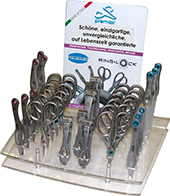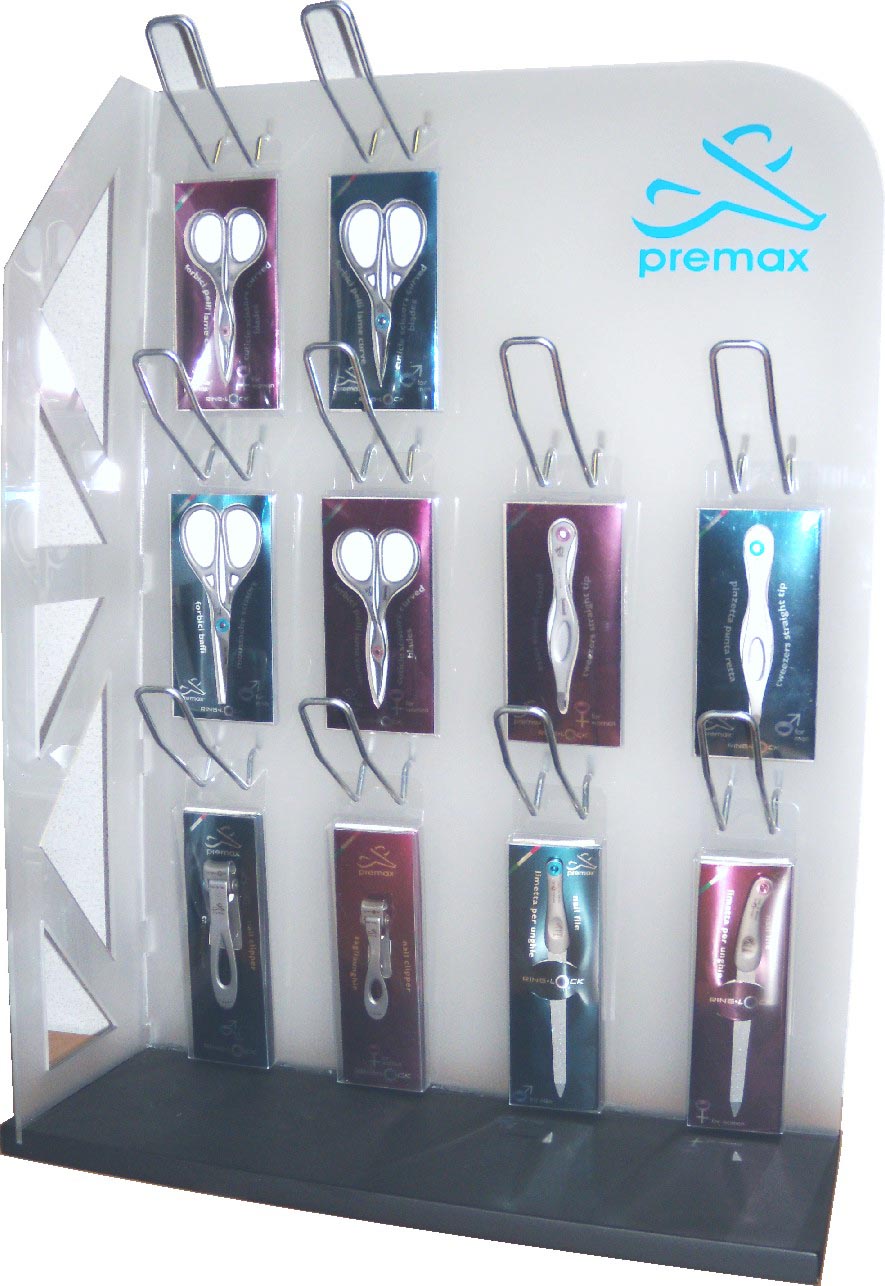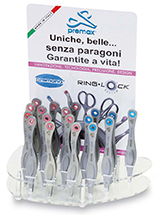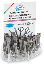 I pratici espositori Premax dedicati alla linea Ring Lock System, da banco, da vetrina o da terra, consentono di presentare le collezioni di forbici estetica, forbici ricamo, forbici estetica e pinzette beauty collection, in modo ordinato e completo con il minimo ingombro. I pratici espositori da banco valorizzano al meglio le nostre forbici professionali, unendo praticità d'uso e ridotte dimensioni di ingombro. |